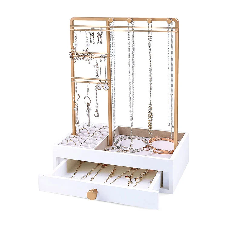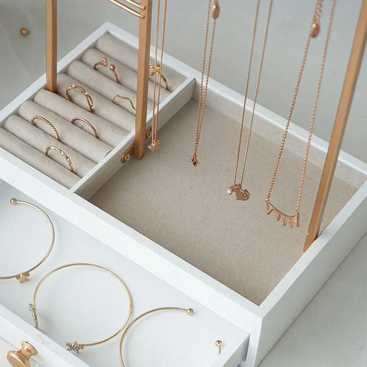 Zona de afișare deschisă a stratului superior: cadru metalic auriu, potrivit pentru agățarea colierelor, cerceilor și brățărilor. Este ușor de văzut și poate fi accesat după cum este necesar.