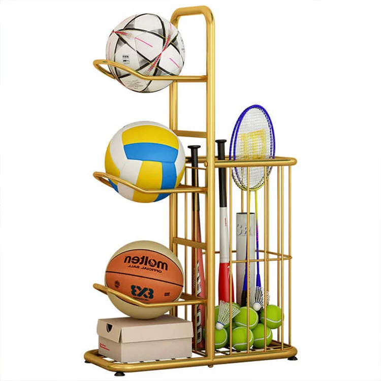 R: Luați ca exemplu mingi de baschet: stratul inferior poate conține 4-6 mingi de baschet; stratul mijlociu poate ține 6-8 mingi de volei sau mingi de fotbal; stratul superior poate conține 12+ rachete de badminton + mai multe mingi mici. Capacitatea totală este suficientă pentru utilizarea în familie sau în echipă mică.